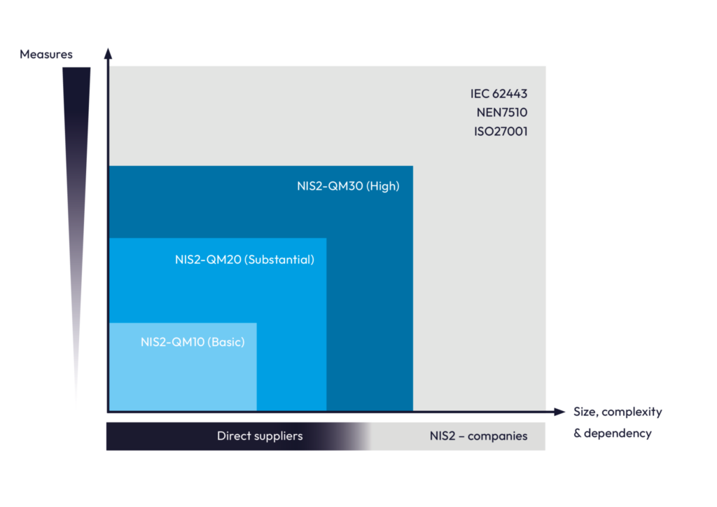 Het NIS2 Quality Mark kent drie certificeringsniveaus: QM10, QM20 en QM30. Voor de meeste mkb-bedrijven die direct of indirect leveren aan NIS2-organisaties, is het behalen van het QM10-certificaat doorgaans voldoende. Dit niveau richt zich op basismaatregelen op het gebied van organisatie, personeel, fysieke beveiliging en technologie. Bedrijven met een hoger risicoprofiel, bijvoorbeeld vanwege de aard van hun diensten of de gevoeligheid van de gegevens waarmee ze werken, kunnen overwegen om voor QM20 of QM30 te gaan. Deze niveaus omvatten aanvullende maatregelen, waaronder operationele technologie (OT) en IT-management.