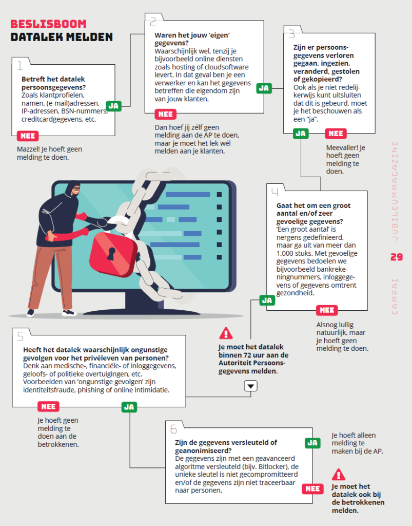 4. Registreer en meld het datalek: Registreer het datalek in je datalekregister en ga na of je het datalek moet melden bij de Autoriteit Persoonsgegevens of de betrokkenen. Volgens de Algemene Verordening Gegevensbescherming (AVG) zijn organisaties verplicht om datalekken binnen 72 uur te melden bij de relevante toezichthoudende autoriteiten. Zorg ervoor dat je op de hoogte bent van de meldingsvereisten en neem contact op met de autoriteiten zodra dit nodig is. Gebruik onze handige Datalek beslisboom als je niet zeker weet of en hoe je een datalek moet melden.