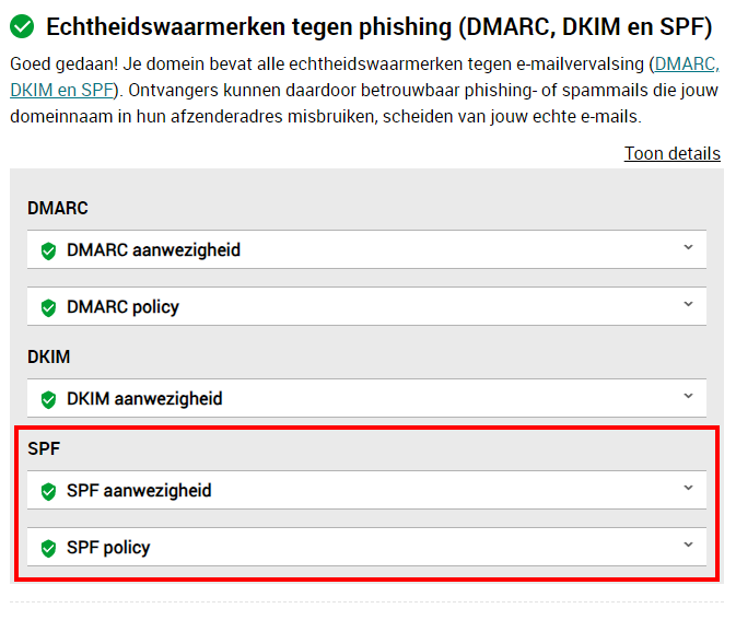 Kijk of de “echtheidswaarmerken tegen phishing” goed zijn ingesteld, en dan in dit geval de SPF-instellingen.