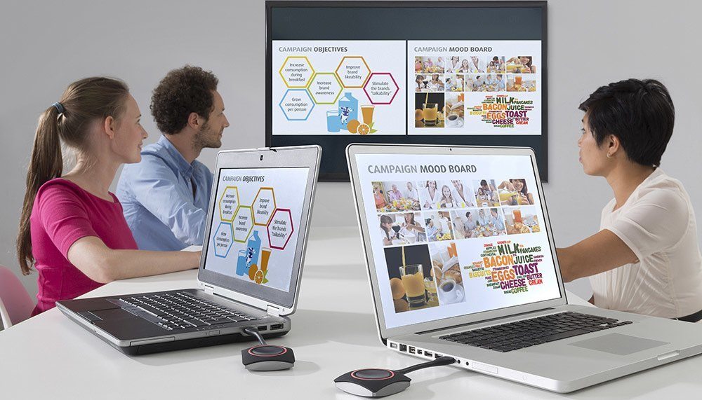 Er zijn natuurlijk ook mogelijkheden om beeld draadloos naar de TV te streamen. Dit kan bijvoorbeeld met de Google Chromecast (€39) voor het streamen van Android Apps en je Chrome browser. De Apple TV (€159) voor iPhone en Mac (Windows met wat hulp). Of de Microsoft Wireless Display Adapter (€60), maar alleen voor apparaten die Miracast ondersteunen. Al deze oplossingen werken best redelijk. Maar om álle laptops, Macbooks en mobiele apparaten te ondersteunen die zoal in je vergaderkamer voorbij komen moet je op z’n minst ál deze apparaten in je TV stoppen. Handig? Niet dus.